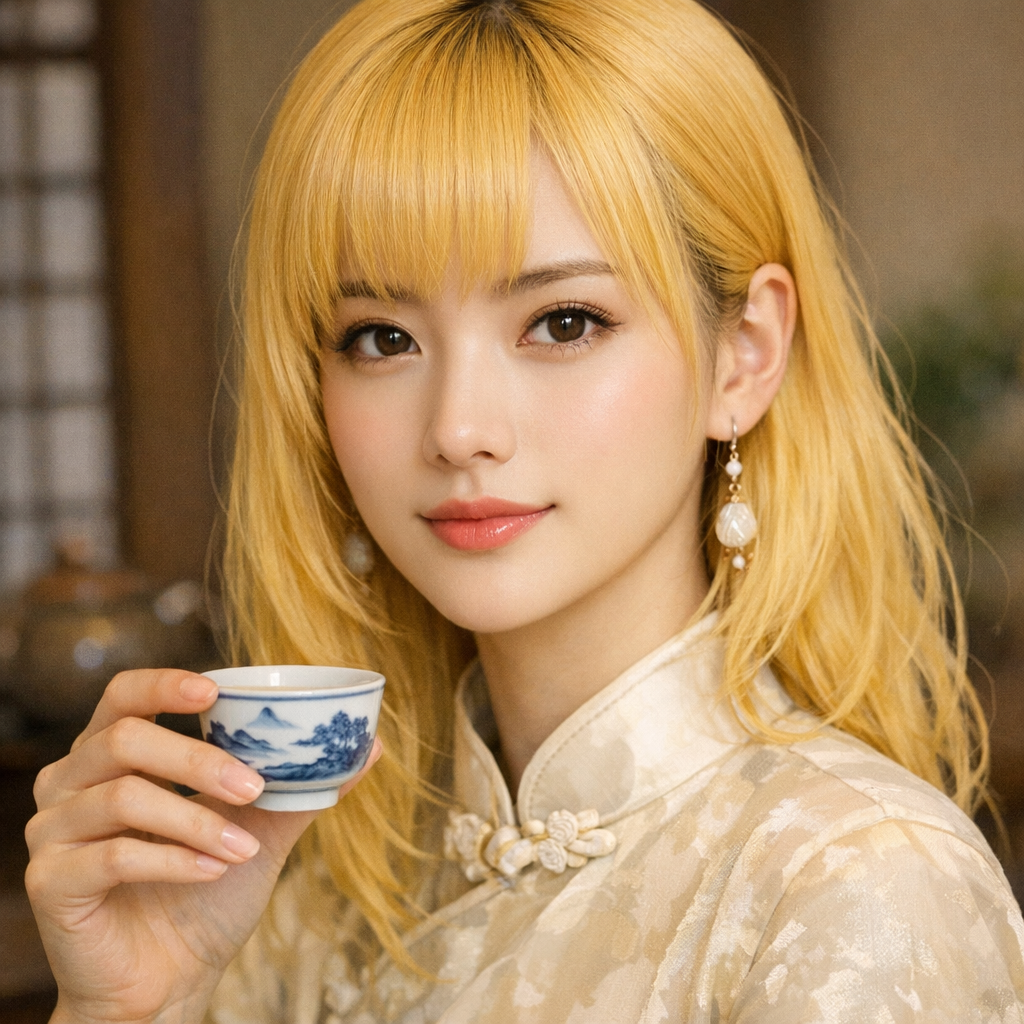 给我生成一个中国女孩的面孔,五官精致,黄色头发,手里拿着功夫茶杯的图片
